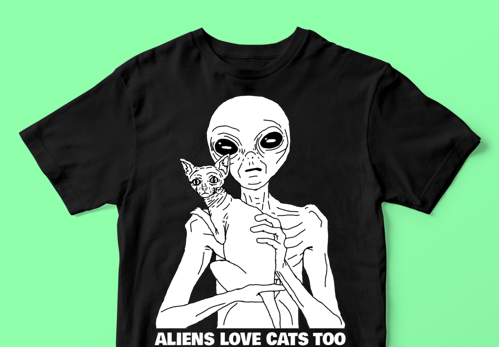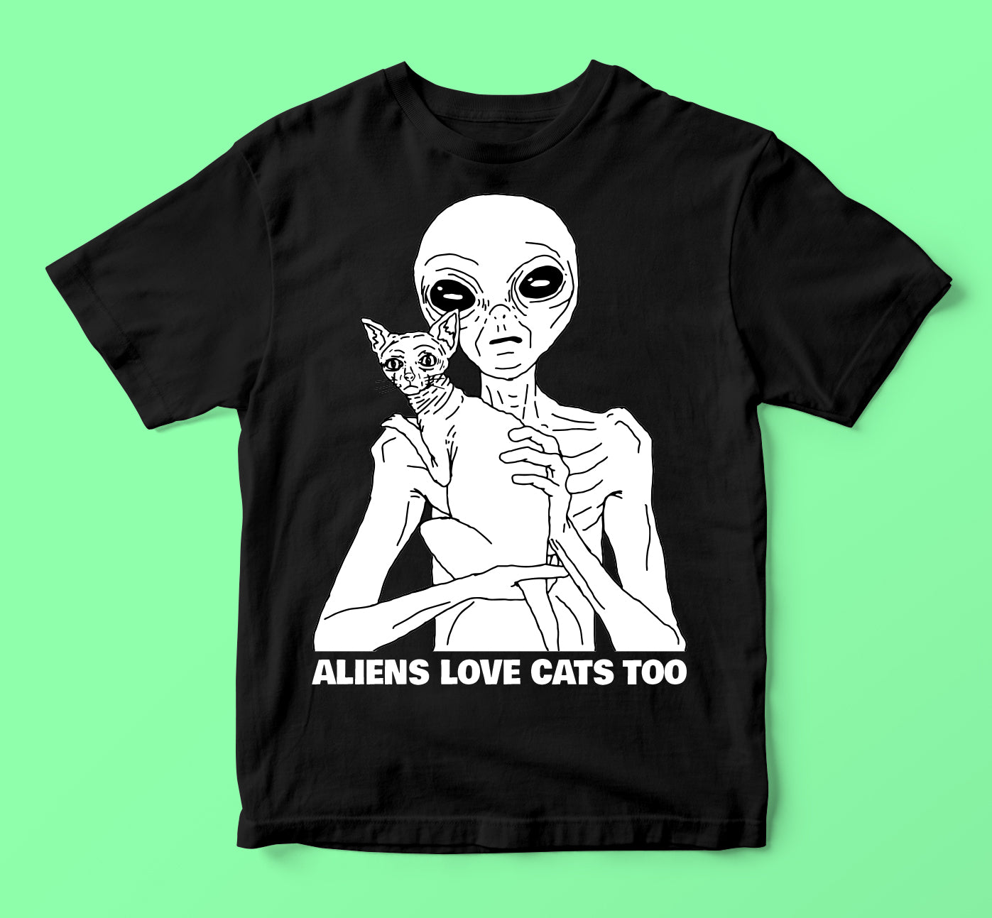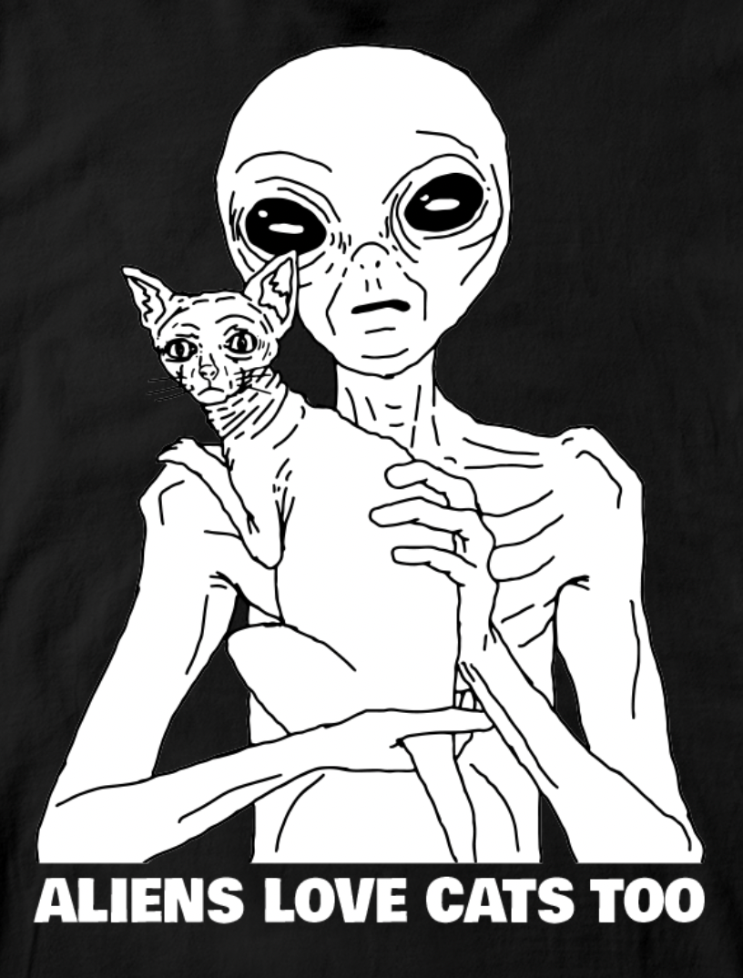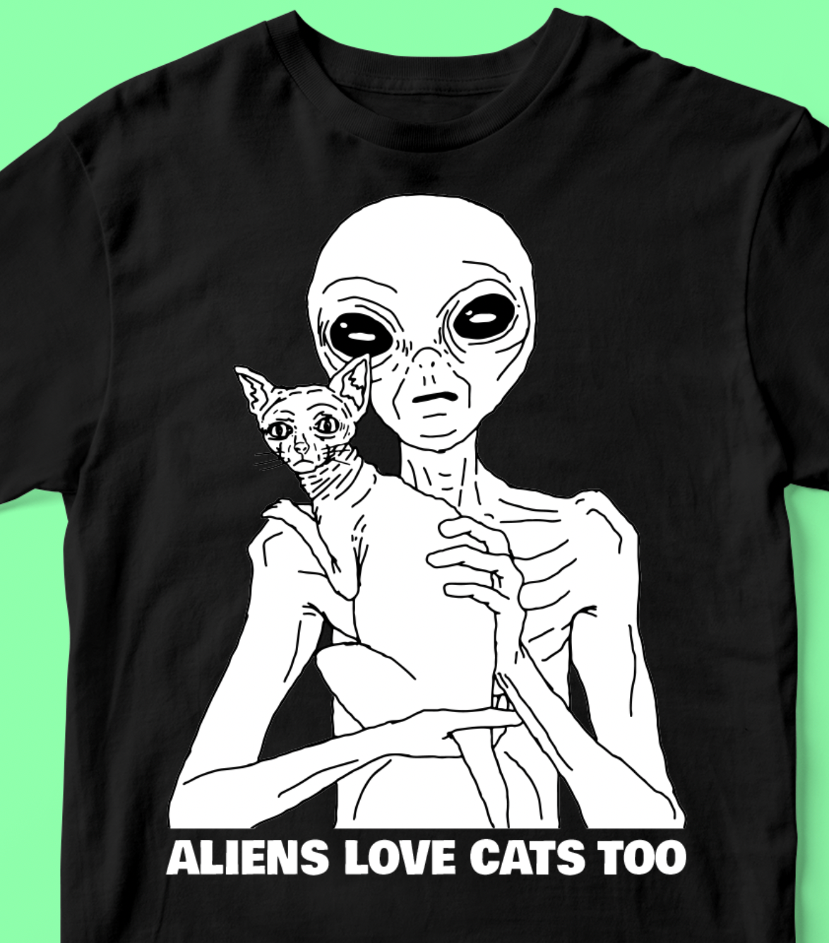 Get ready to be abducted by cuteness with our "Aliens Love Cats Too" shirt. Featuring an ‘adorable’ alien holding a furry feline, this black tee is a perfect fit for any cat and sci-fi enthusiast. Made from soft and comfortable fabric, it's sure to become a staple in your wardrobe. Show the world that aliens and cats are a match made in intergalactic heaven. Order yours now and be the coolest cat in the galaxy!