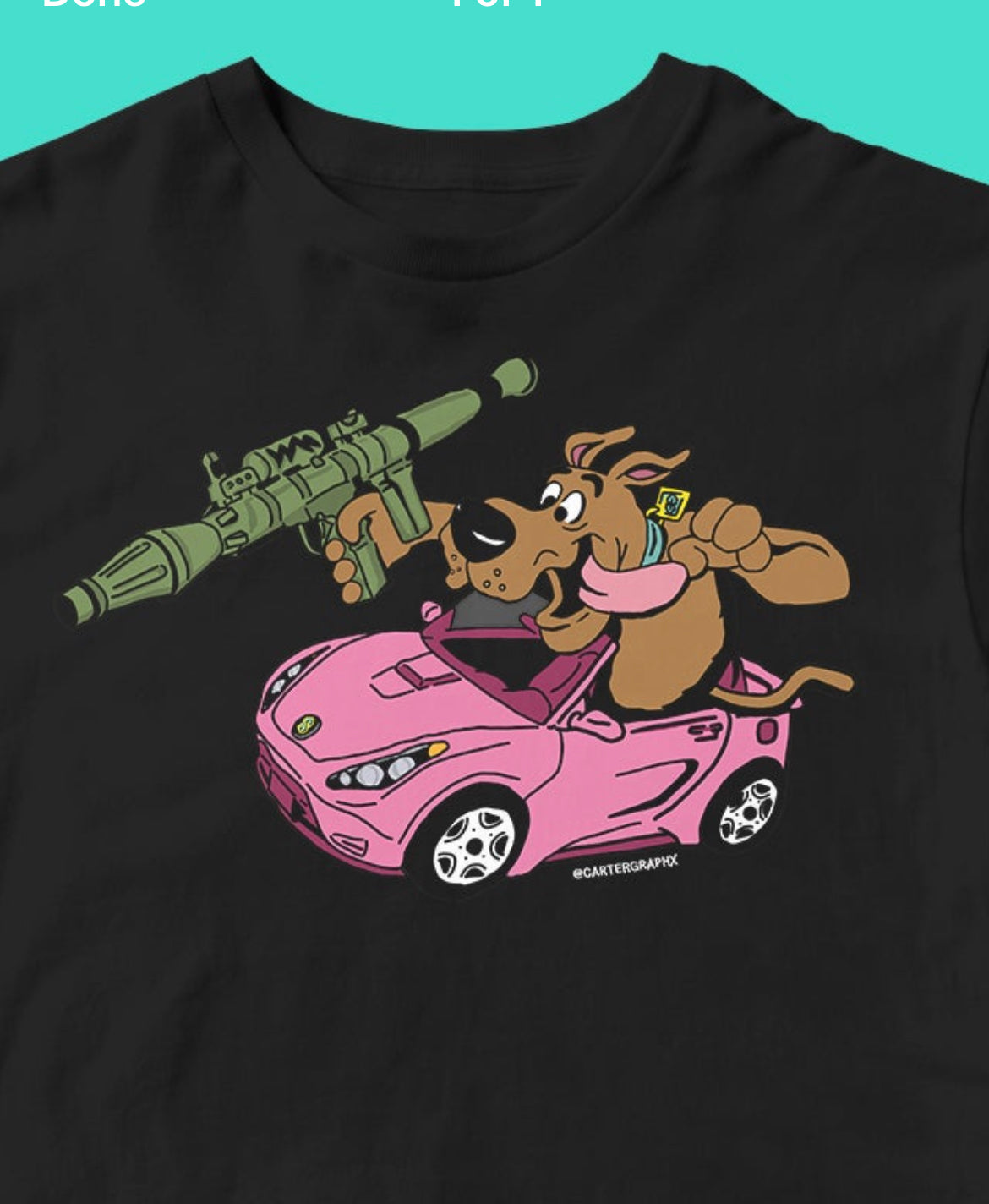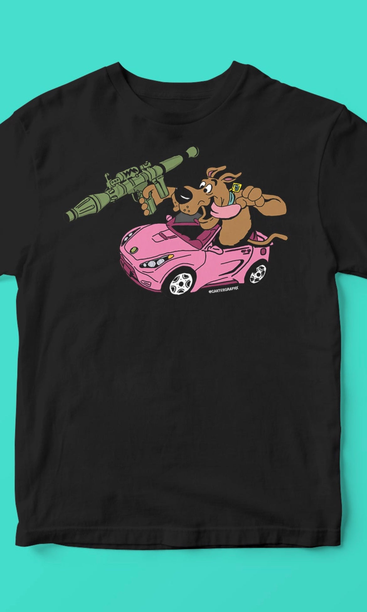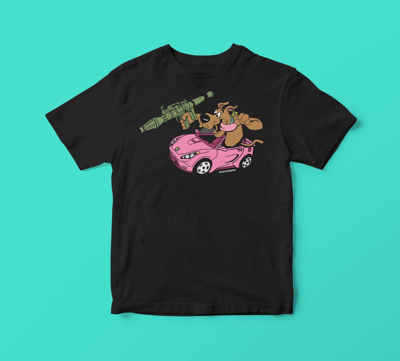 Get ready for some high-speed, tongue-wagging action with our "Bazooka-Doo" t-shirt. Featuring a crazy dog holding a bazooka while driving pink sports car on a black t-shirt. With its tongue out in the wind and a mischievous look in its eyes, this dog is crazy!