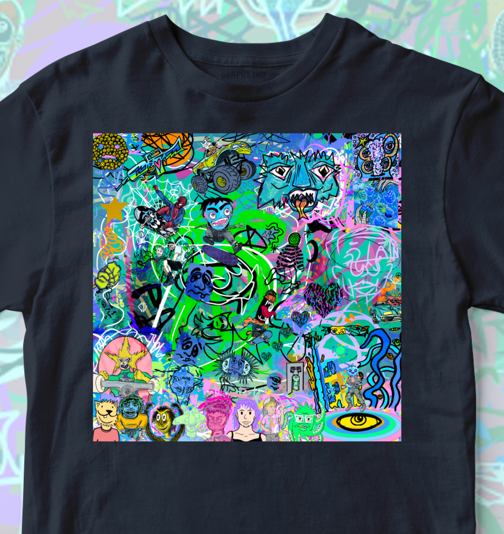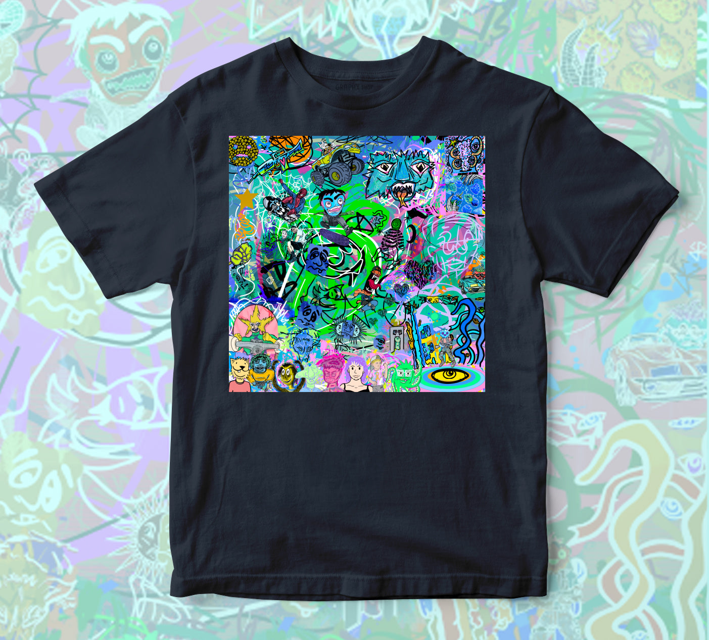 2022 was pretty crazy, this is some of our doodles all collaged together in one big splat puzzle print on a navy t-shirt.