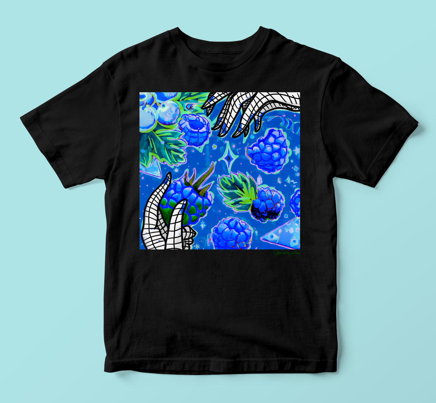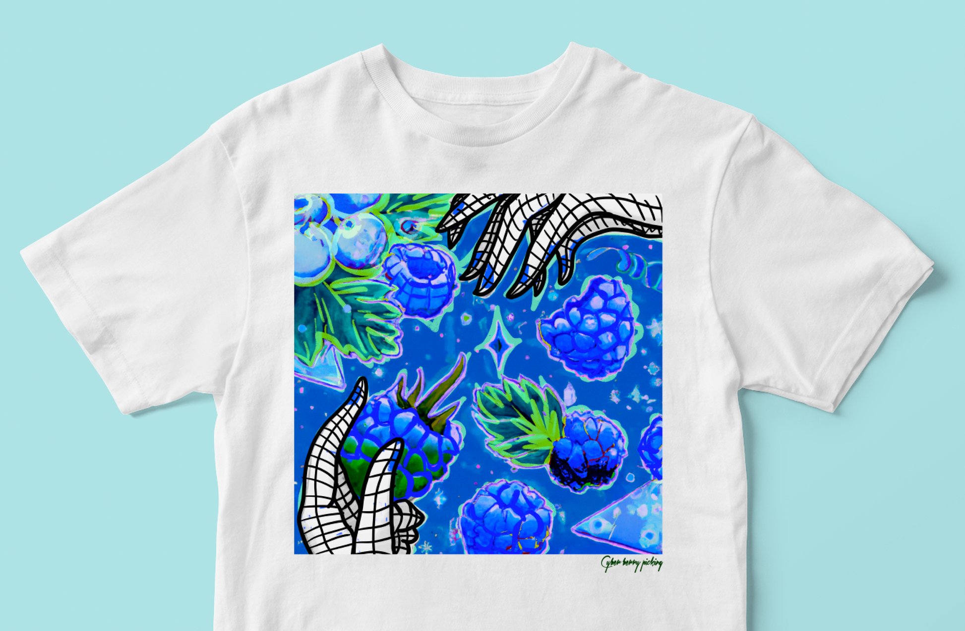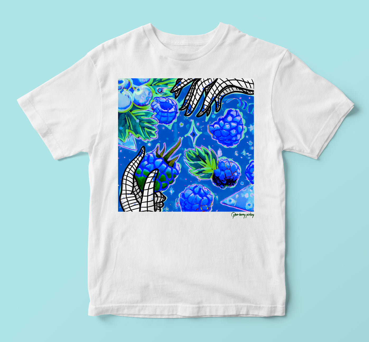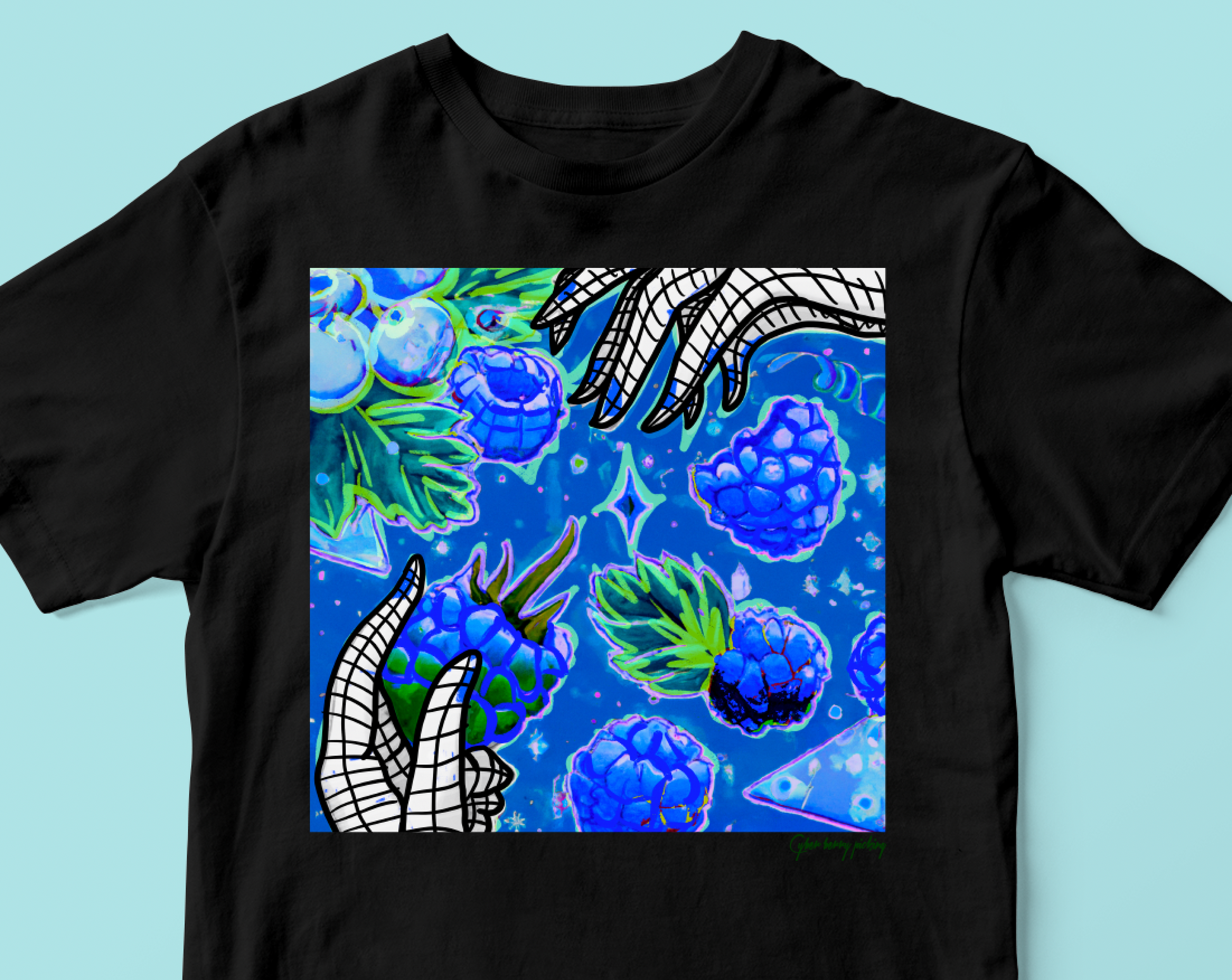 "Cyber Berry Picking" t-shirt features a whimsical design of a robot picking blue raspberries off a futuristic bush. Made from soft, breathable fabric, this t-shirt is perfect for everyday wear. The bold graphic design is eye-catching and unique, making it a great conversation starter. With its comfortable fit and fun design, the "Cyber Berry Picking" t-shirt is the perfect addition to any tech-savvy or futuristic wardrobe.