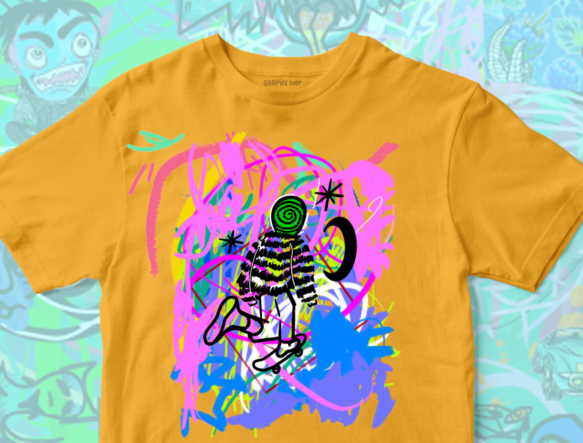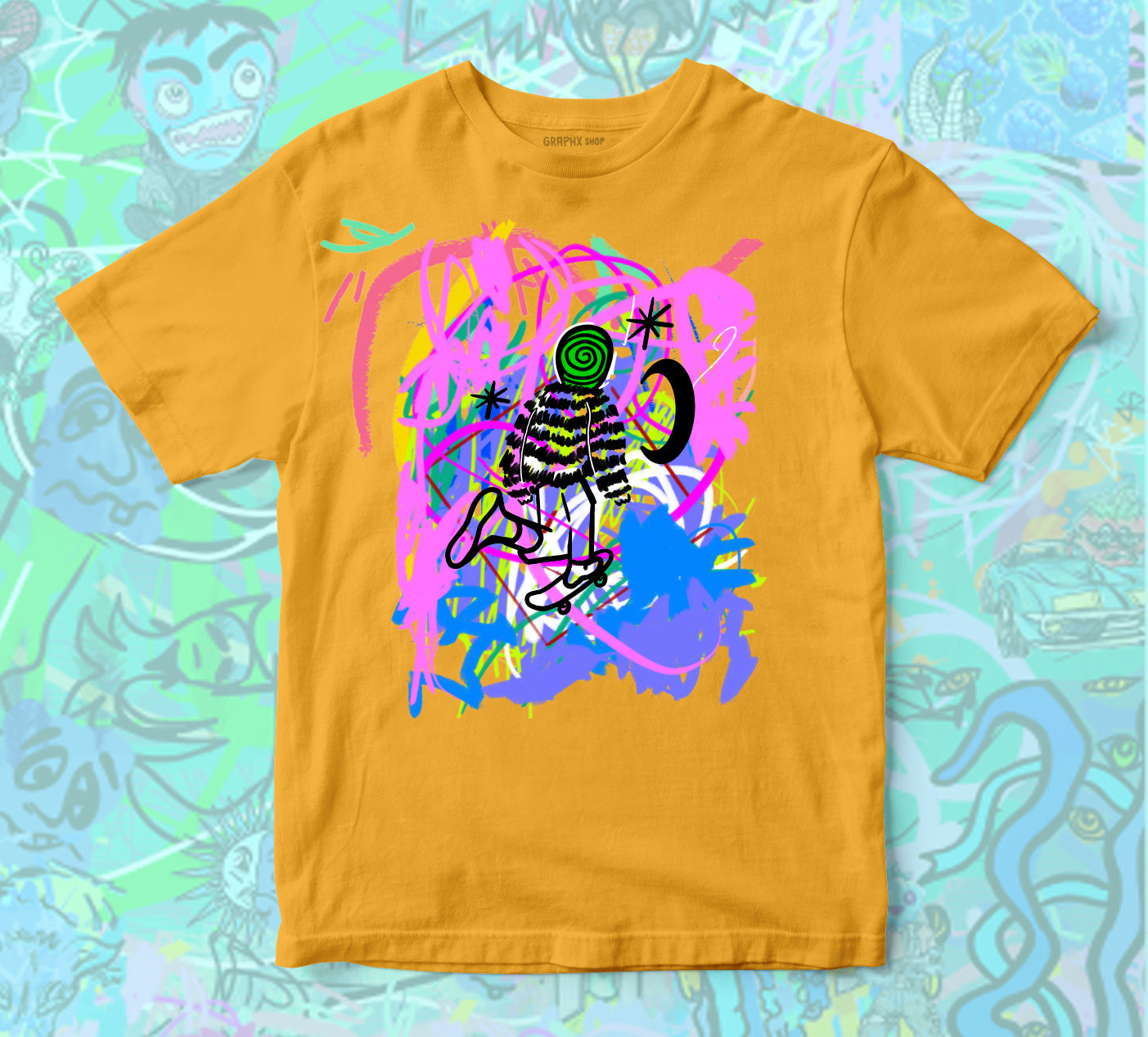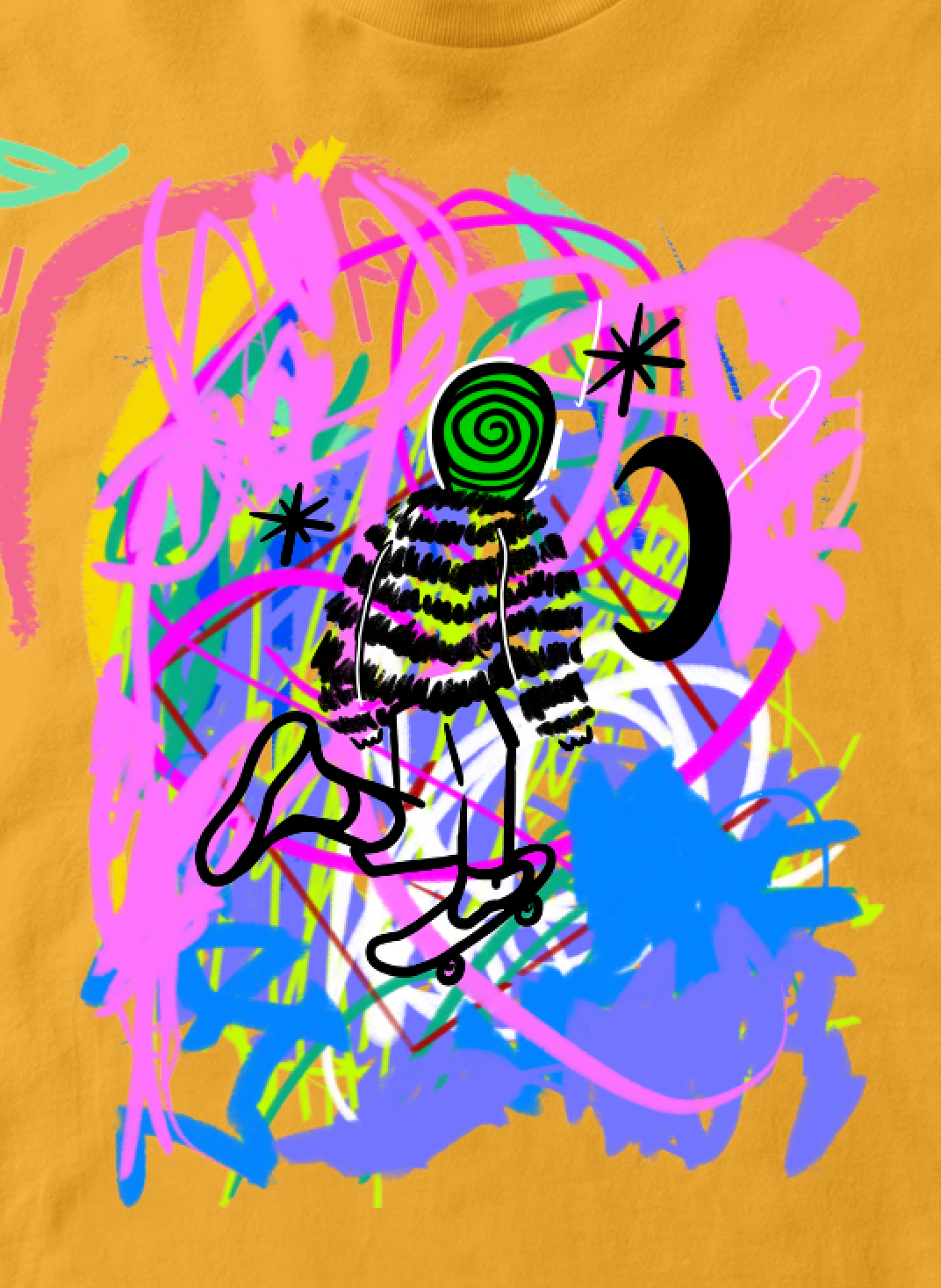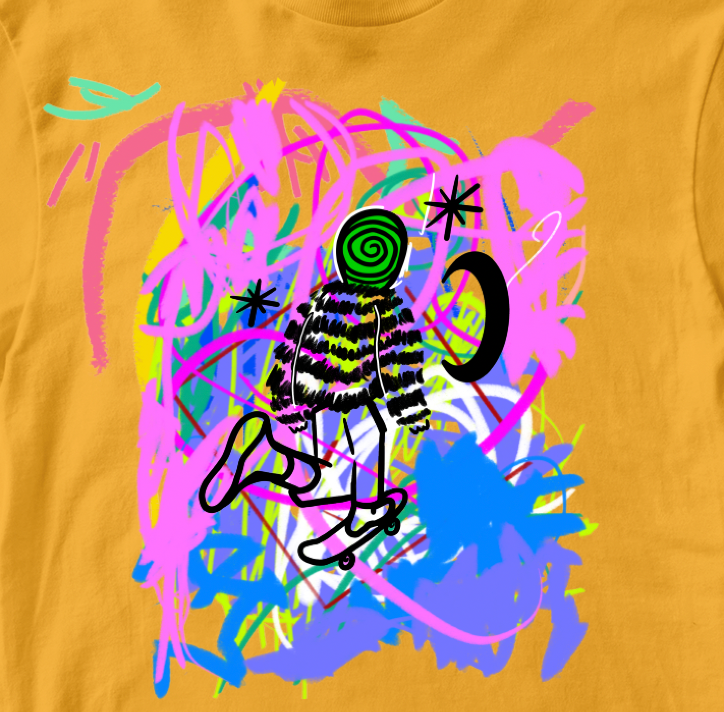Kick Push - Featuring a design with a skateboarder pushing through abstract color splotches and scribbles. Featured in Gold or Black