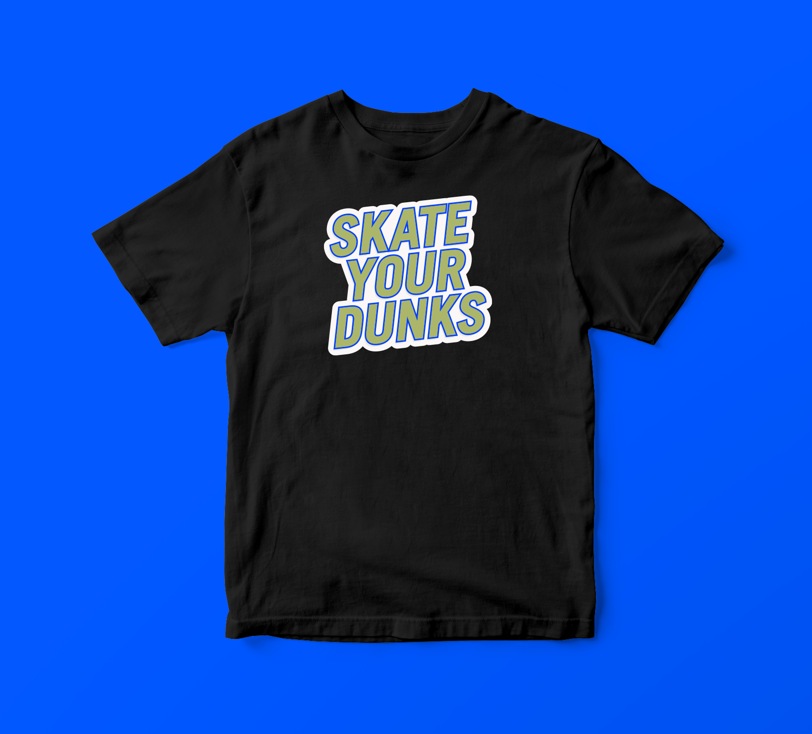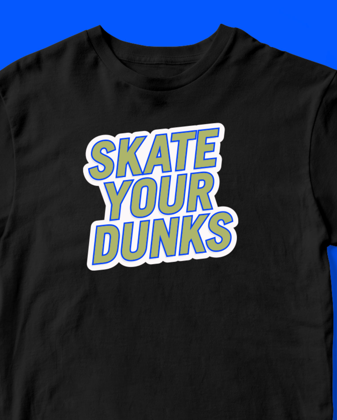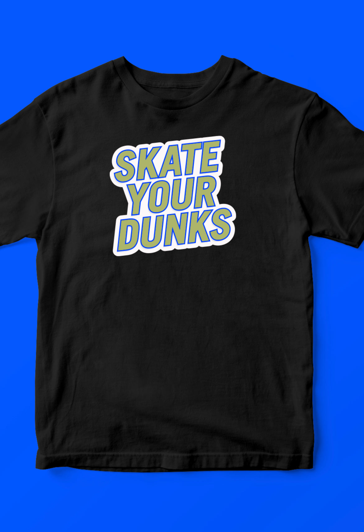 The "Skate Your Dunks" t-shirt is a must-have for any skateboarder who loves to shred in style. The bold font and simple design of the words "Skate Your Dunks" make a statement that is impossible to ignore. Made from high-quality materials, this t-shirt is built to last and keep up with your active lifestyle. Whether you're out on the streets or in the park, this shirt is the perfect way to show your love for skateboarding and your favorite Dunks.